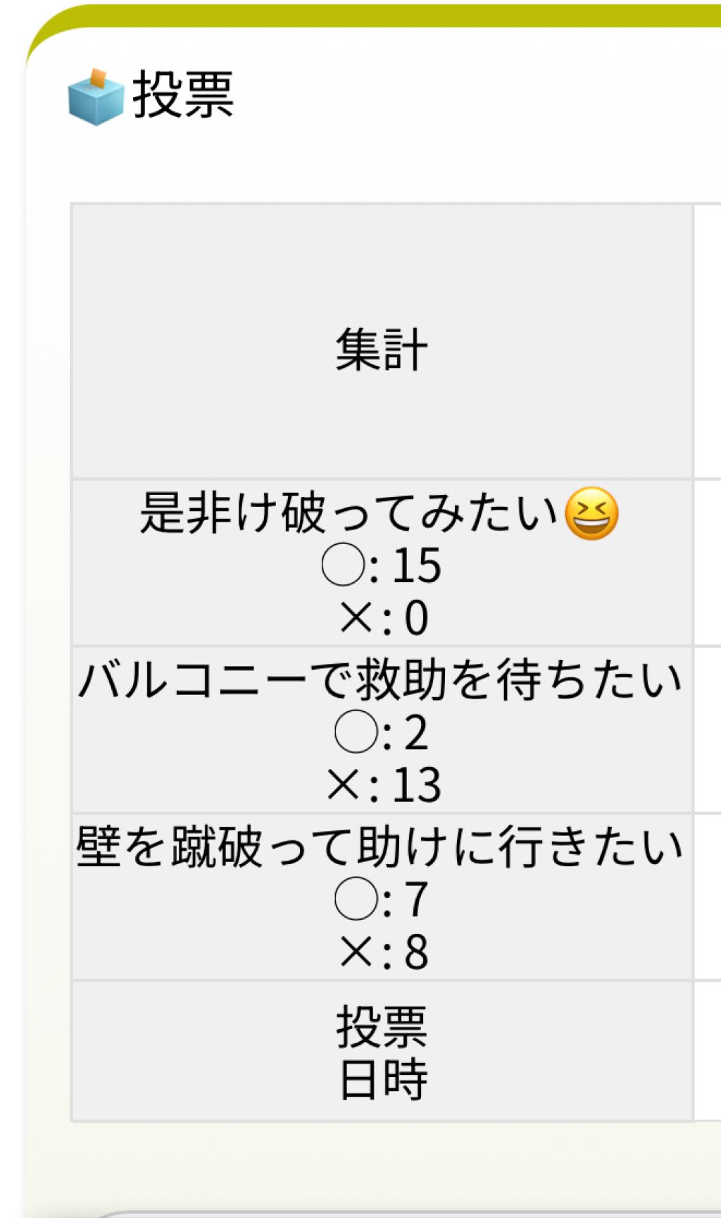 バルコニーで救助を待ちたい ◯: 2 ×: 14 |
